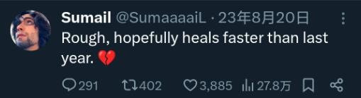 2023年迎来SumaiL的茶队在短暂的蜜月期后一败涂地,他们在巴厘Major上过早淘汰没能攒够积分,错失直邀,预选赛中又早早爆冷,连四强都没能打进。不同的赛区,不同的队伍,相同的末路,SumaiL赛后发推:“很难熬,希望可以比去年更快从失败中恢复”。
